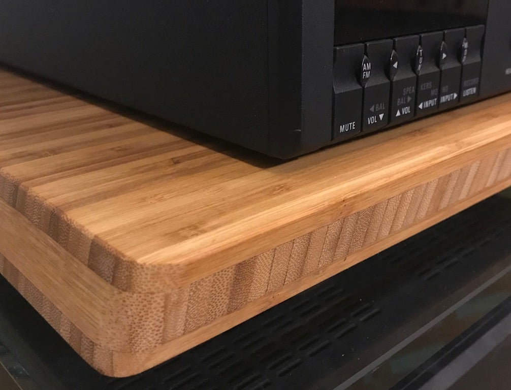 Wieso eignet sich das APTITLIG Brett so hervorragend als Unterlage und warum brauchen wir sowas überhaupt? Elektronische Geräte werden üblicherweise von äusseren Vibrationen geschützt auf Gummifüßchen platziert. Damit ist aber den Vibrationen, die im Gerät entstehen, zB durch Trafos, die Beschallung durch die Lautsprecher etc. nichts entgegengesetzt. Zähes, hartes und langfasriges Holz saugt solchen Vibrationsenergie am besten ab, besonders wenn es in 3 Schichten in unterschiedlichen Richtungen zueinander verleimt wird. Schneidet man noch eine Rinne hinein, ist das ganze auch als Brett für die Küche zu brauchen und so in großer Stückzahl zu verkaufen. Preis pro Stück ca 15 €. Mit 45 cm Breite und 36 cm Tiefe hat es bei 3 cm Dicke immerhin fast 4 kg Gewicht.