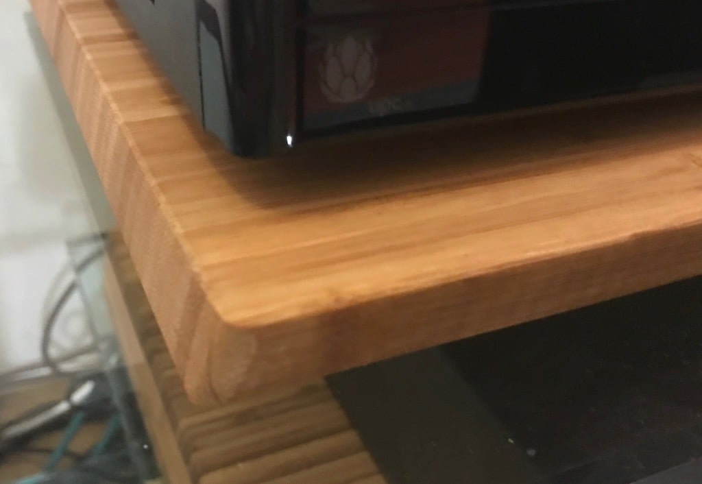 Da mein Verstärker 43 cm tief ist, wollte ich für ihn zwei der Bretter zwecks Test ausprobieren und habe das beim Gespräch mit meinem Architekten (Cousin, der unsere Terrasse verschönern soll) angesprochen. Und was sagt er, er habe noch ein großes Arbeitsplatten-Reststück aus Bambus (kreuzverleimt und 5 cm dick) in seiner Werkstatt von einem anderen Projekt übrig.