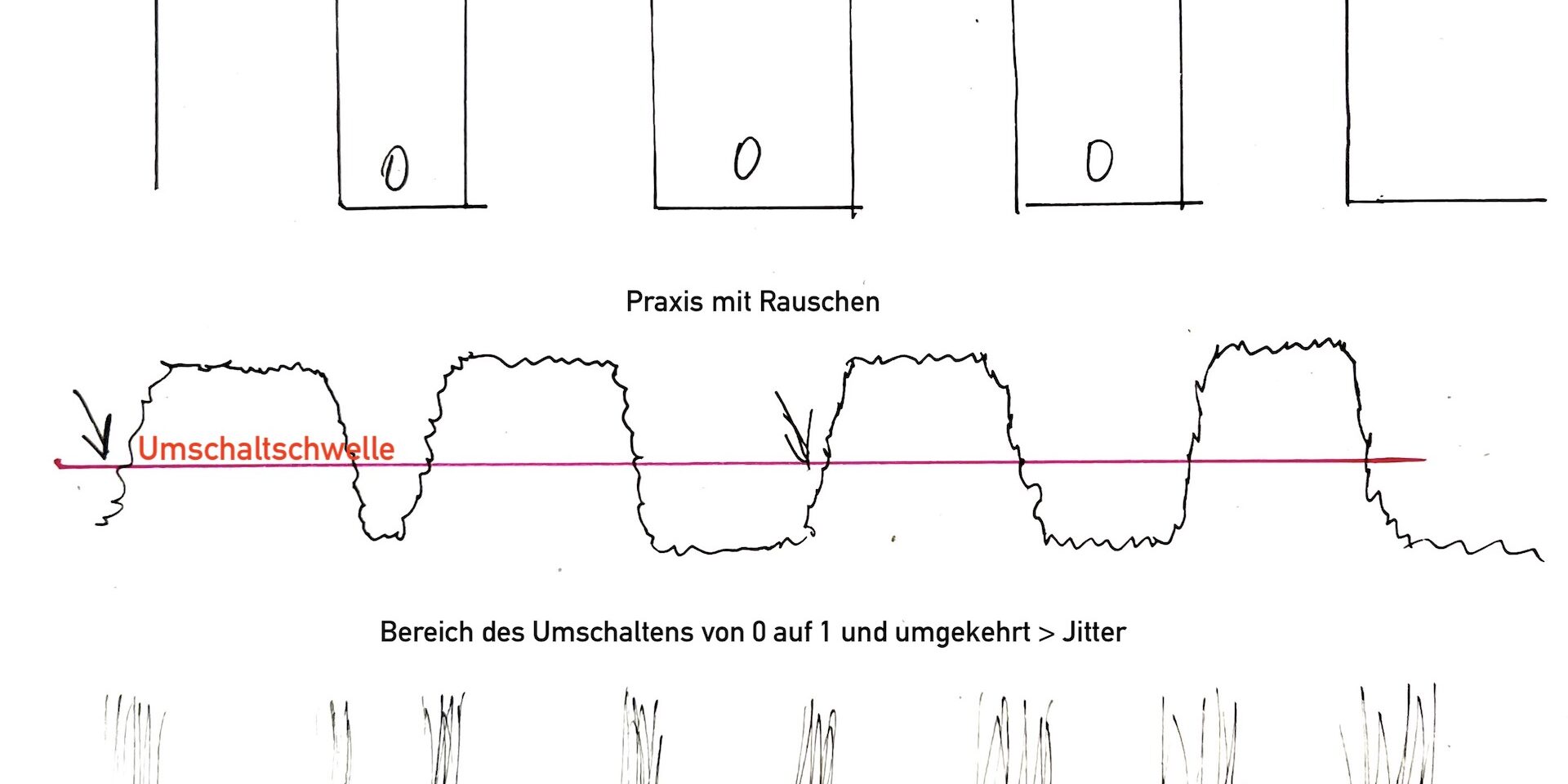 Ein digitales Signal wird immer als Rechteck dargestellt, in Abfolge 0, also unten, dann schwupp ohne Verzögerung oben also 1. Theoretisch ja. In der Praxis würde ein perfekt steiler Wechsel von 0 nach 1 unendliche Bandbreite benötigen, die es aber nie gibt. Daher dauert der Wechsel von 0 nach 1 oder 1 nach 0 eine endliche Zeit. Das bedeutet die Spannung , die von 0 Volt nach 5 Volt zumeist wechselt ändert sich in Form einer Aufwärtsbewegung. Jetzt kommt aber in der Praxis noch Rauschen dazu, Vom Netzteil, aus der Luft durch Einstreuungen, von Radio-Wellen, Fernsehsendern, Wifi-Routern oder gar – apage satanas- vom Powerline Übertrager. Dass sogar ein renommierter Blog wie Alpha Audio dafür noch Werbung macht, bringt mich zur Weissglut und mein Patreon-Engagement dort zum Ende.