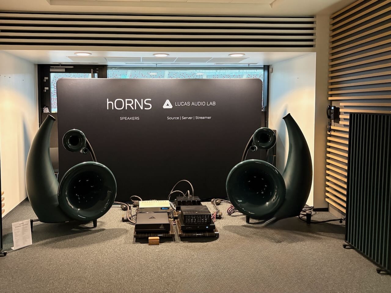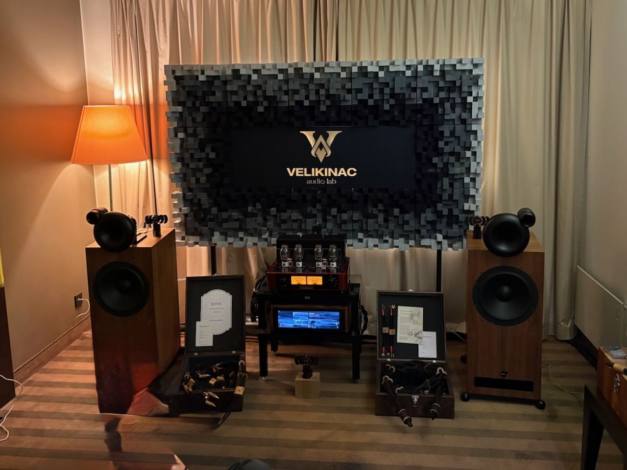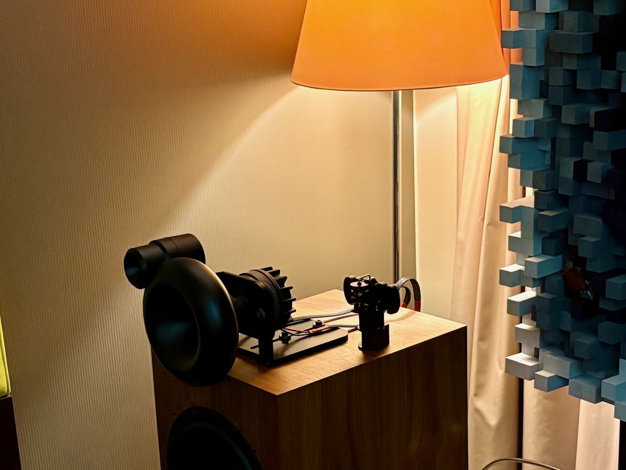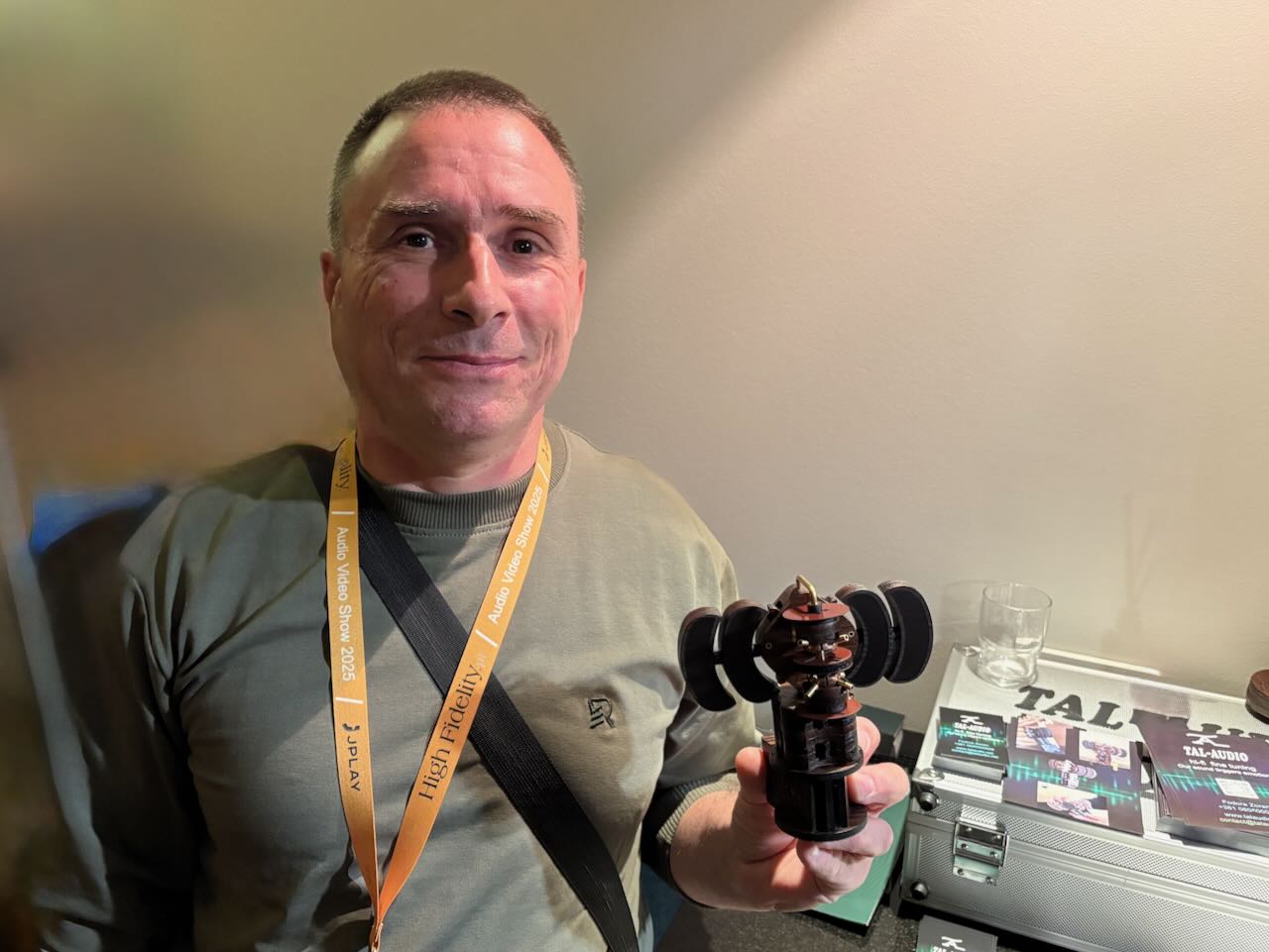 Ganz winziges aber hab ich entdeckt beim Velikinac Audio Lab. Zuerst haben mich die Lautsprecher begeistert, mit Horn-Mittel- und Hochtöner und konventionellem Bass war ihr Spiel sehr sauber und tief, vor allem aber große Bühne. Dann ist mir das kleine Männchen aufgefallen auf den Boxen. Und der Vater dieses Dings das „Quisco“ heißt, Fodora Zoran von Tal-Audio hat mir gezeigt , wie sehr dieser rein mechanische Resonator die Bühne vergrößert. Nimmt man sie weg, fällt alles in sich zusammen scheinbar. Sehr beeindruckend. Aber das winzige Männlein ist sehr aufwändig gemacht und der Hersteller war fast etwas vorsichtig , als er den Preis von 1500.- € erwähnt hat. Für eine große Anlage für mich kein Thema, dass diese Investition ok ist. Hoffe Velikinac kommt nach Wien und führt auf der HighEnd 2026 ebenfalls vor. Siehe auch bei den Bildern.