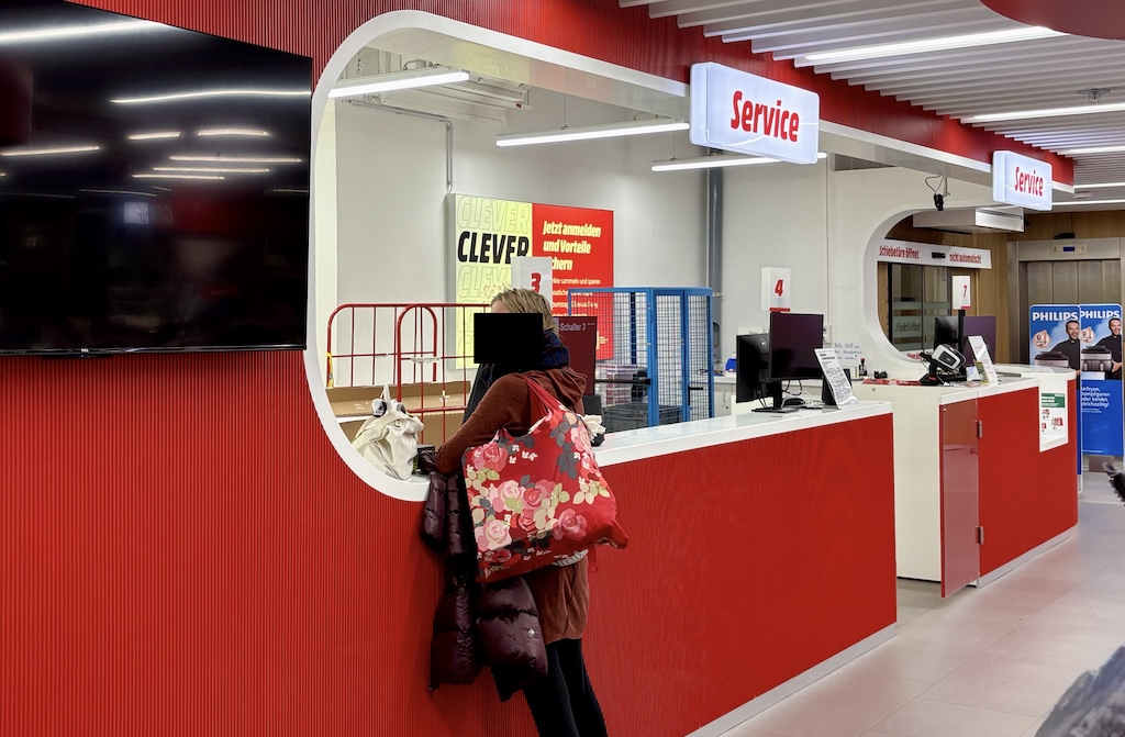 Der Mann an der Kasse kann das nämlich nicht stornieren, das kann nur die Serviceabteilung. Und die ist im hintersten Eck. Also muss ich den Hindernislauf vor der Kasse wieder retour laufen, weil direkten Zugang zum Verkaufsraum gibts nicht, und mich auf den Weg zum „Service-Center“ machen .