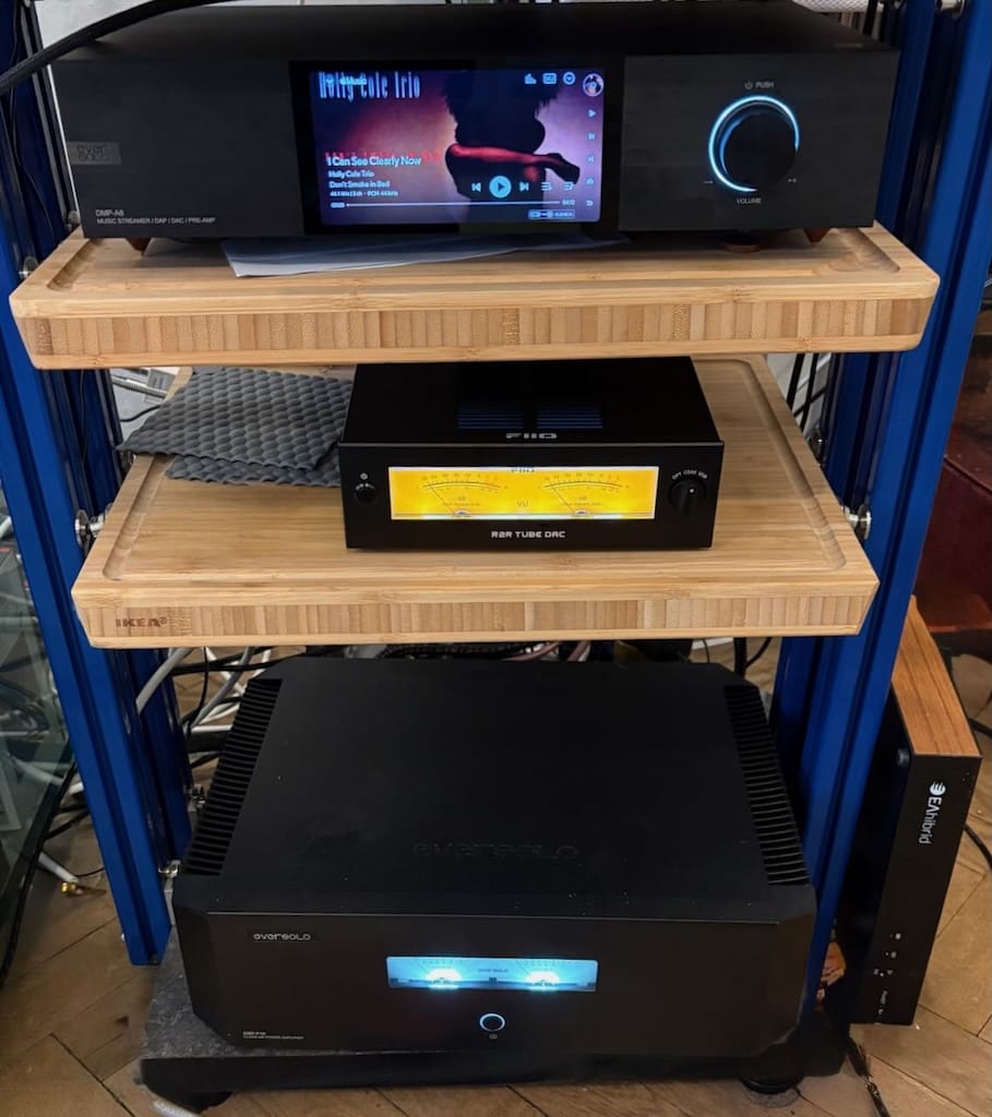 Mein ungarischer Freund ist im Besitzt einer Anlage, die schon seit langem eines meiner Endziele verkörpert. Eine wunderschöne Sonus Faber wird von ungarischen Röhrenverstärkern gespeist , ein Eversolo A8 streamt die Musik daher und ein opulentes Plattenlaufwerk sorgt für feines von Vinyl. Dazu noch ein Wuchtiger CD-Spieler und – vor allem – viele nicht gerade billige Kabel, sowohl für Stromversorgung als auch Cinch- und XLR-Verbindungen. Alles zusammen sorgfältig zusammengehört, ein Traum.