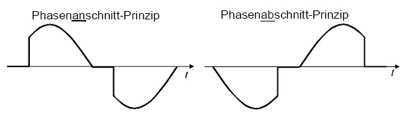 In dieser Wirkungsweise heißt das PhasenANschnittsteuerung, weil die Phase am Anfang beschnitten wird. Der Strom wird also plötzlich eingeschaltet, es entsteht eine scharfe Flanke. Und wie wir von Herrn Fourier wissen , bedeutet das höhere Frequenzen werden hinzugefügt, denn das Signal ist nicht mehr Sinusrund sondern hat eine Ecke bekommen . PhasenABschnittssteuerung bedeutet wir schalten ein am Beginn, aber AB während das Signal irgendwo schwingt. Auch eine Kante aber nicht so schlimm wie bei ANschnittssteuerung. Wann wir Ein- oder Ausschalten bestimmt die Helligkeit.