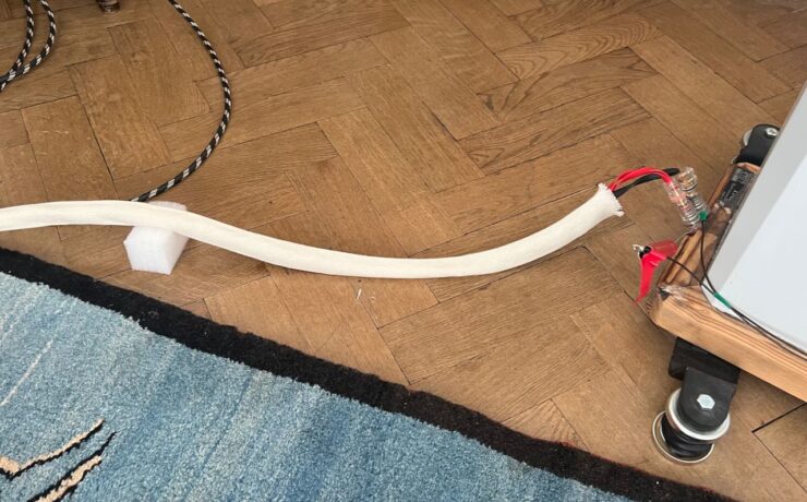 Hört mal wer da hämmert. Oder eher klebt. Als „Room Treatment“ würden das Audiophile bezeichnen. Das Fernsehgerät wird entschärft. Reflexionen von Wänden sind ja meist auf der Aufnahme zu finden,
